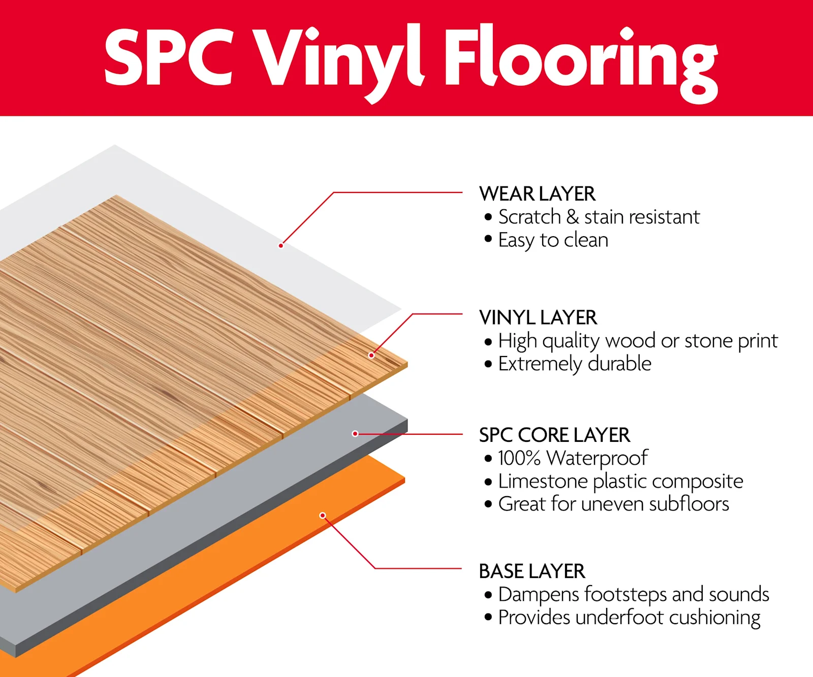 The main components of SPC flooring include wear-resistant layer, vinyl surface layer, SPC core layer and backing layer. The wear layer is the clear layer that protects the vinyl layer from scratches and abrasions. The vinyl topping provides the aesthetic design and color of the floor. The SPC core is made of limestone, PVC and plasticizers for dimensional stability, durability and water resistance. Underlayment is an optional layer that can be added to provide additional sound insulation, moisture protection and comfort to the floor. SPC flooring is a hard core floor, which means it contains no wood or wood derivatives and is 100% waterproof.